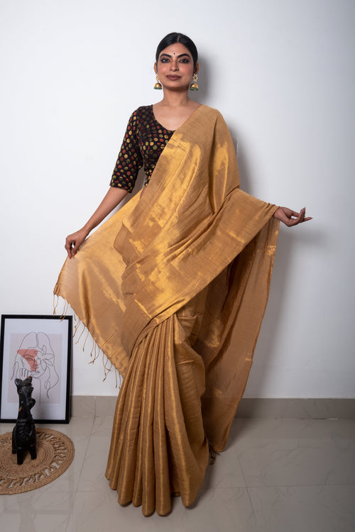 Beige Golden Cotton Tissue Saree