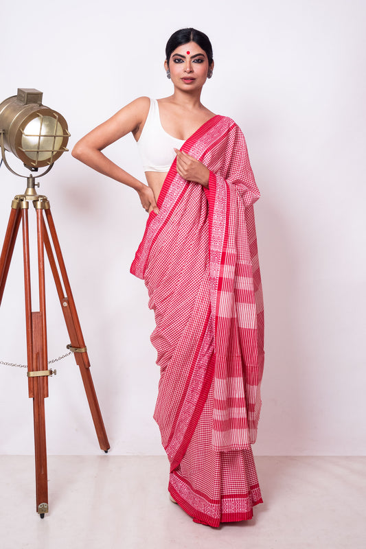 Red White Check Cotton Dhaniakhali Saree with Woven Fish Borders