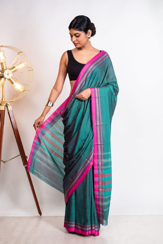Sea Green Cotton Dhaniakhali Saree with Pink Borders