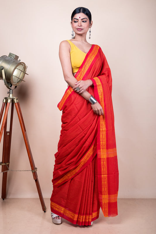 Red Yellow Check Cotton Dhaniakhali Saree with Woven Fish Borders