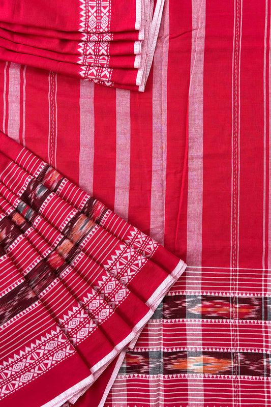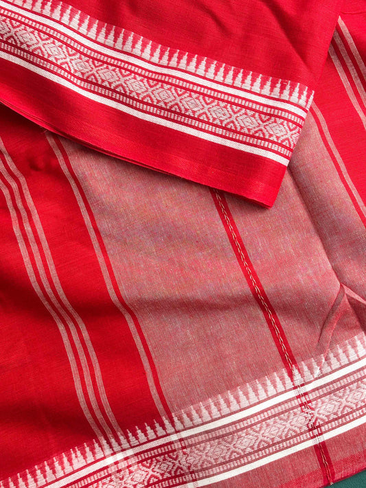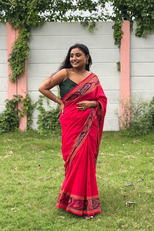 Red Cotton Dhaniakhali Saree with woven Ikat Borders