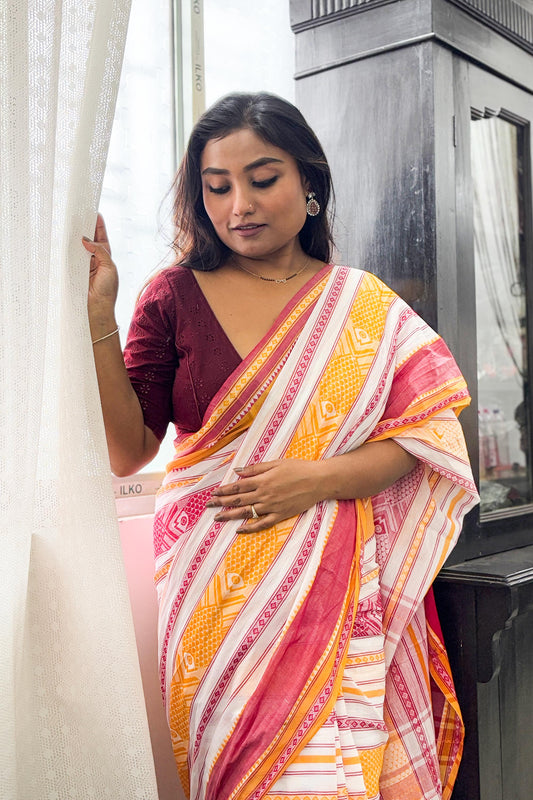 Red-Yellow Fish Motifs Dhaniakhali Cotton Saree