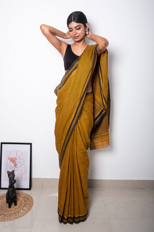Yellow Black Cotton Small Check Dhaniakhali Saree with Thin Borders