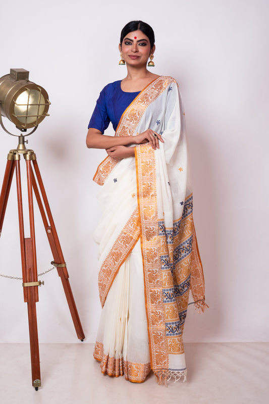 Off White Cotton Handloom Woven Human Figure Baluchari Saree