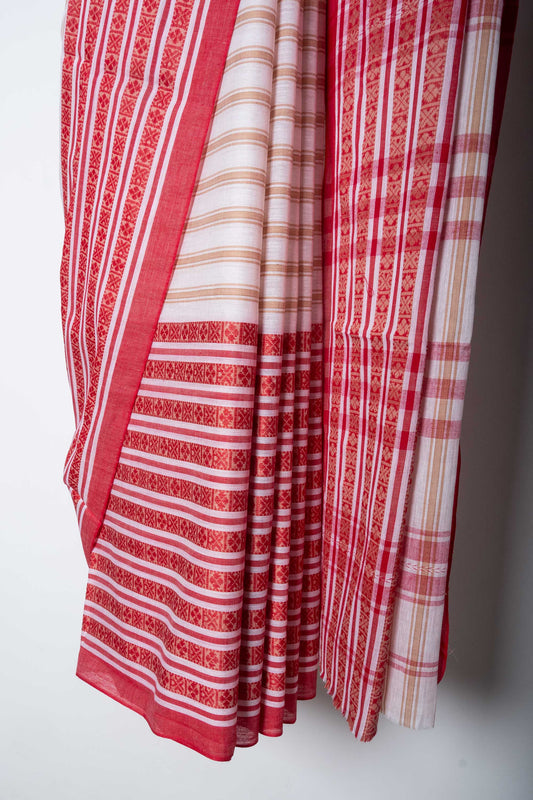 White Beige Stripe Cotton Dhaniakhali Saree With Woven Red Border