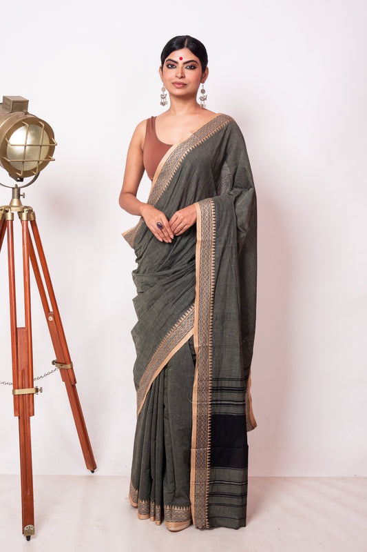 Grey Cotton Dhaniakhali Saree with Black Thin Woven Borders