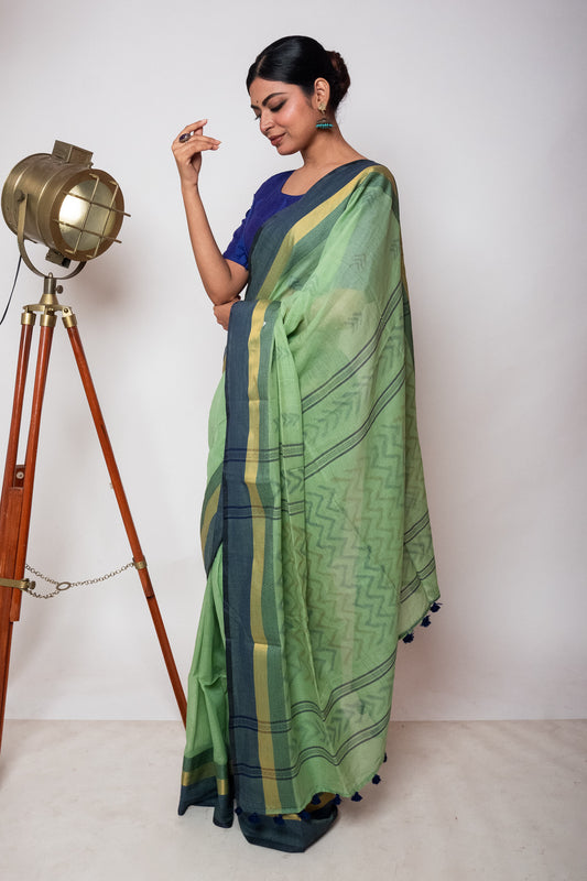 Pista Green Bengal Cotton Saree with Dual Color Border