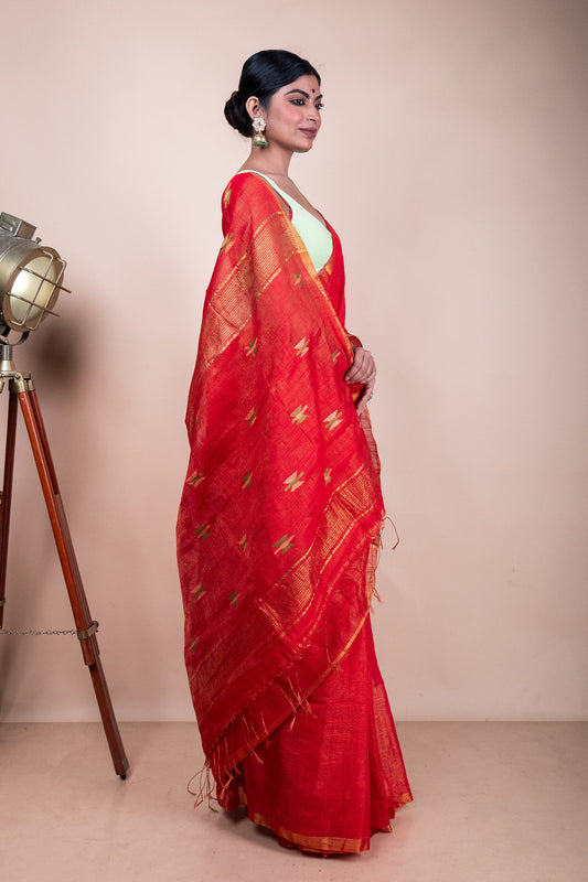 Tomato Red Semi-Tissue Saree with Handwoven Buttis