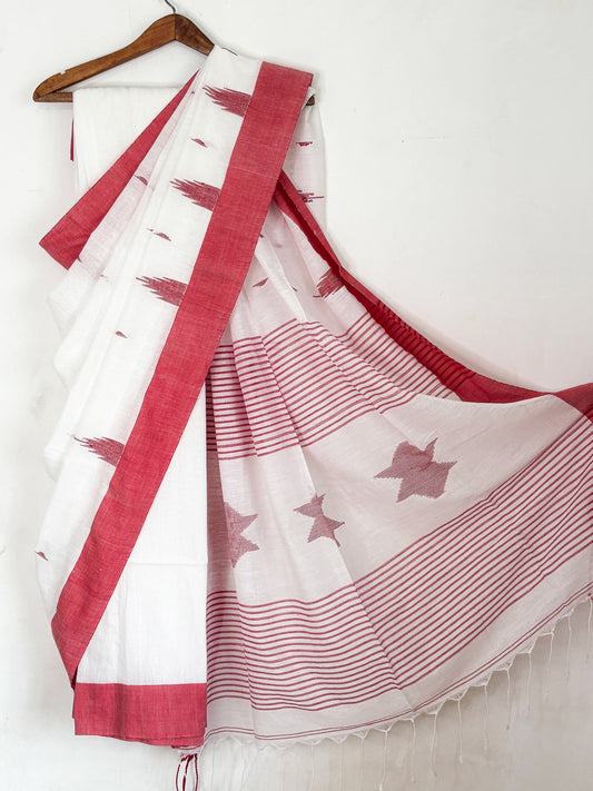 White Red Bengal Cotton Saree with Template woven motifs border & Star Woven Palla